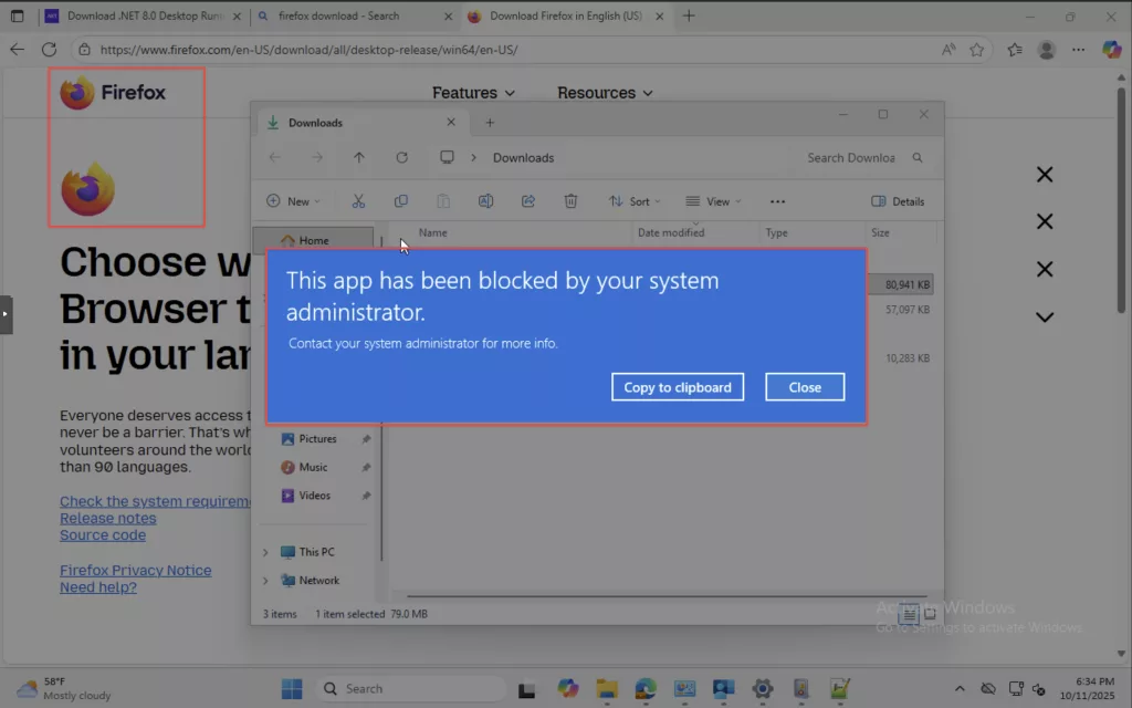 After that, I tried to install Mozilla Firefox on my test device and I got this message:
